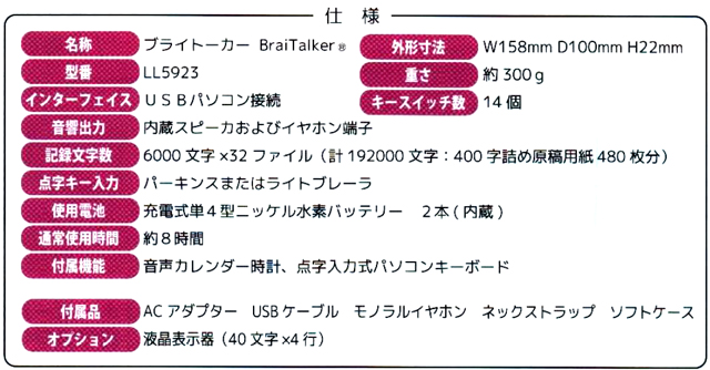 「BraiTalker(ブライトーカー)」は、福祉システム研究会の内山幹男氏の発案をもとに、内山氏と、エクセルオブメカトロニクス株式会社が、国立障害者リハビリテーションセンター研究所の協力のもと開発した6点点字入力機器です。